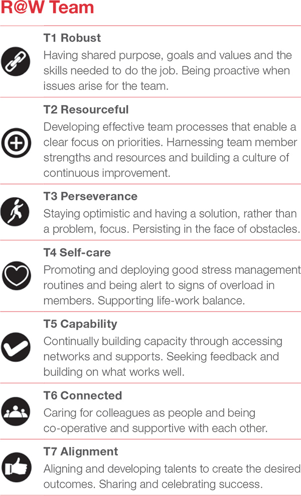 R@W TeamThe R@W Team is the aspect of the Toolkit that measures team resilience. It complements and builds on the R@W Individual by assessing the behaviours that create resilience in groups of people who work together. The R@W Team incorporates aspects traditionally known as essential for teamwork but also includes elements that are emerging as important team behaviours for challenging jobs. The measure has been designed to focus on actions that can be implemented by the team itself. While group-level actions can be inhibited by external demands, both within and outside of the organization, the premise is that teams can still create a sub-culture that contributes to resilience BUY NOW!